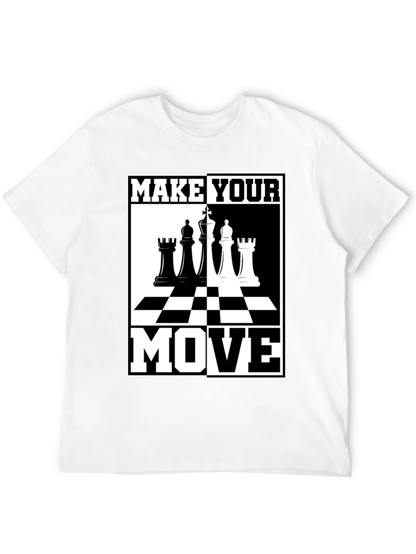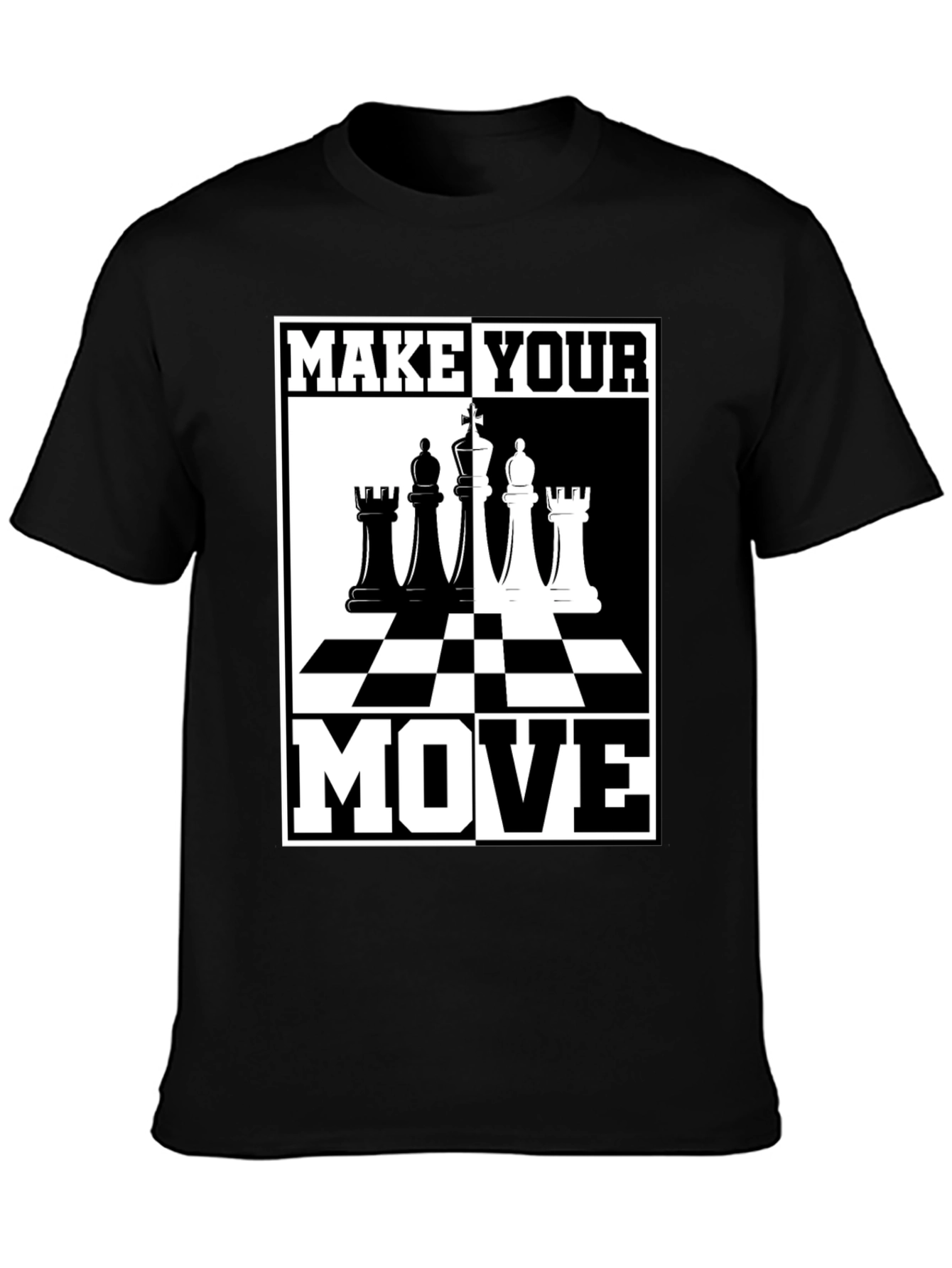 Muestra tu pasión por el ajedrez con esta llamativa camiseta negra. Con un diseño gráfico impactante en blanco y negro que presenta piezas de ajedrez sobre un tablero a cuadros y la frase inspiradora 'MAKE YOUR MOVE' (Haz tu Movimiento). Fabricada en algodón suave y cómodo, esta camiseta de manga corta es perfecta para el uso diario. Ideal para jugadores de ajedrez, aficionados a los juegos de estrategia o para aquellos que aprecian un diseño audaz y original. Combínala con tus jeans favoritos para un look casual y expresa tu afición por el ajedrez con estilo.