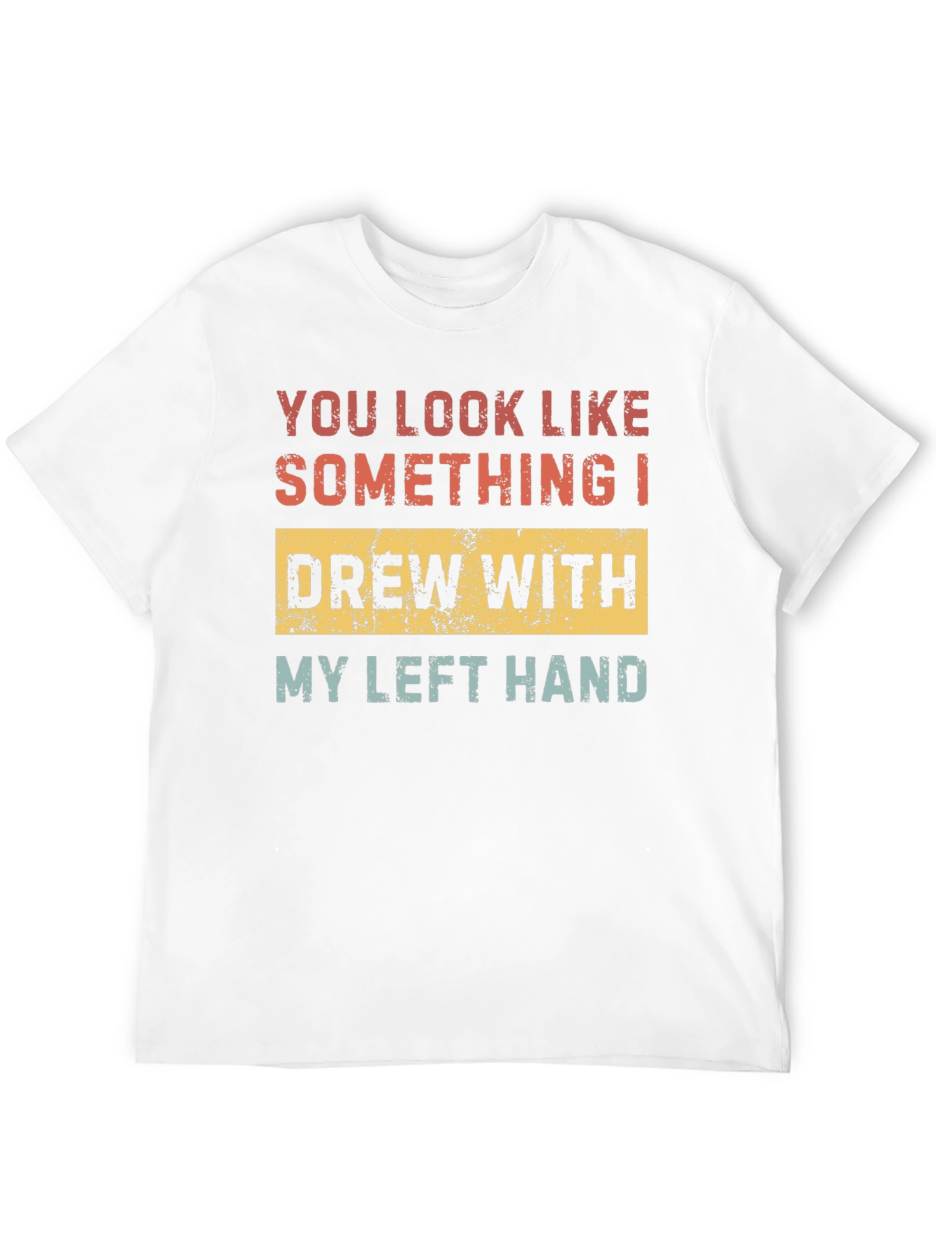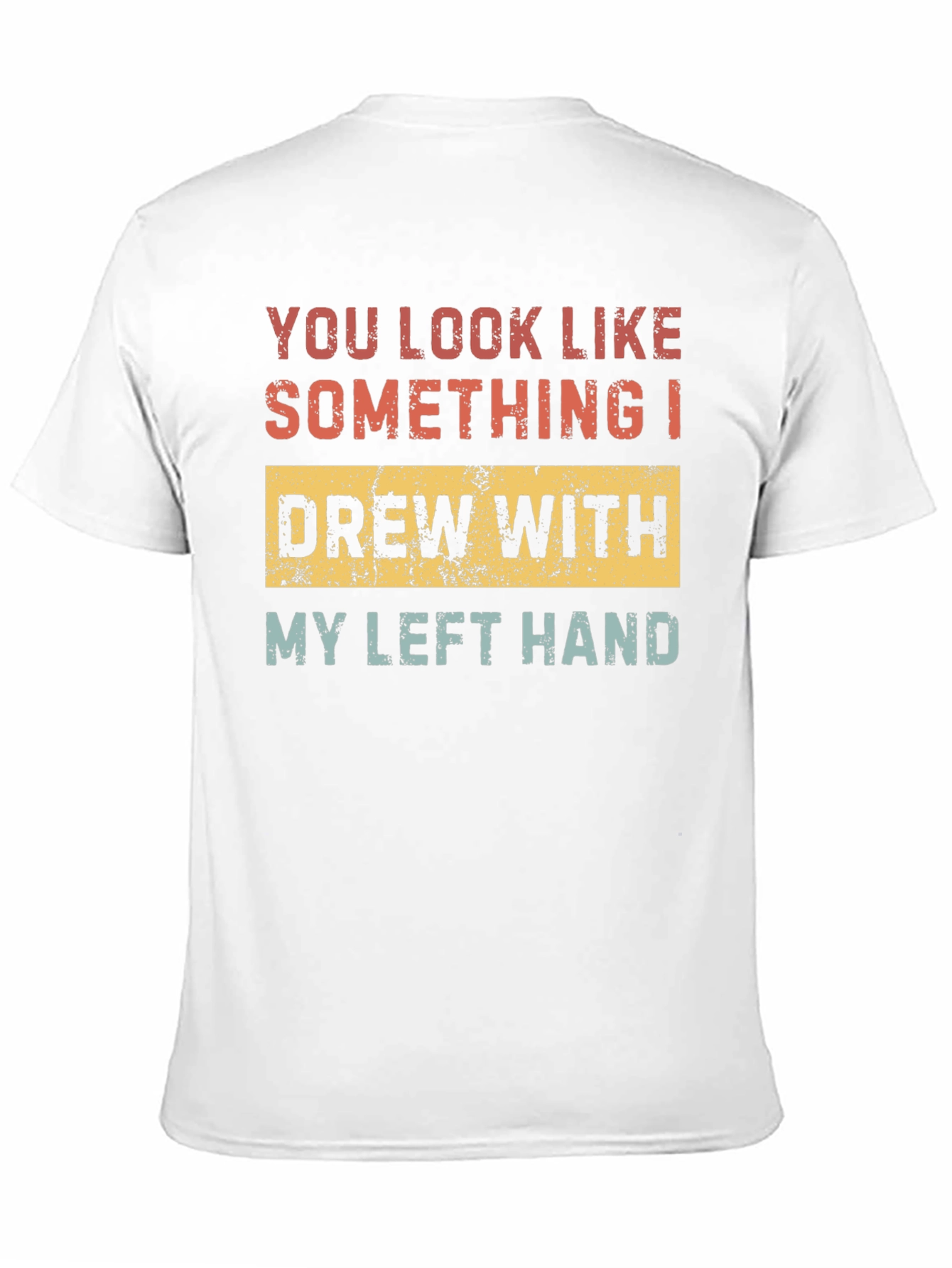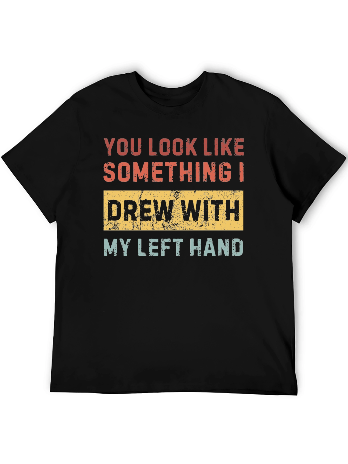 Esta camiseta negra presenta una divertida frase que seguro llamará la atención: "YOU LOOK LIKE SOMETHING I DREW WITH MY LEFT HAND" (Te pareces a algo que dibujé con mi mano izquierda). La frase está impresa en tres colores, dando un toque retro y original al diseño. El material parece ser de algodón suave, ideal para uso diario y cómodo. Perfecta para regalar a amigos con sentido del humor o para añadir un toque irreverente a tu propio estilo. Úsala en reuniones informales, fiestas o simplemente para expresar tu personalidad única. ¡Prepárate para recibir cumplidos y sonrisas!