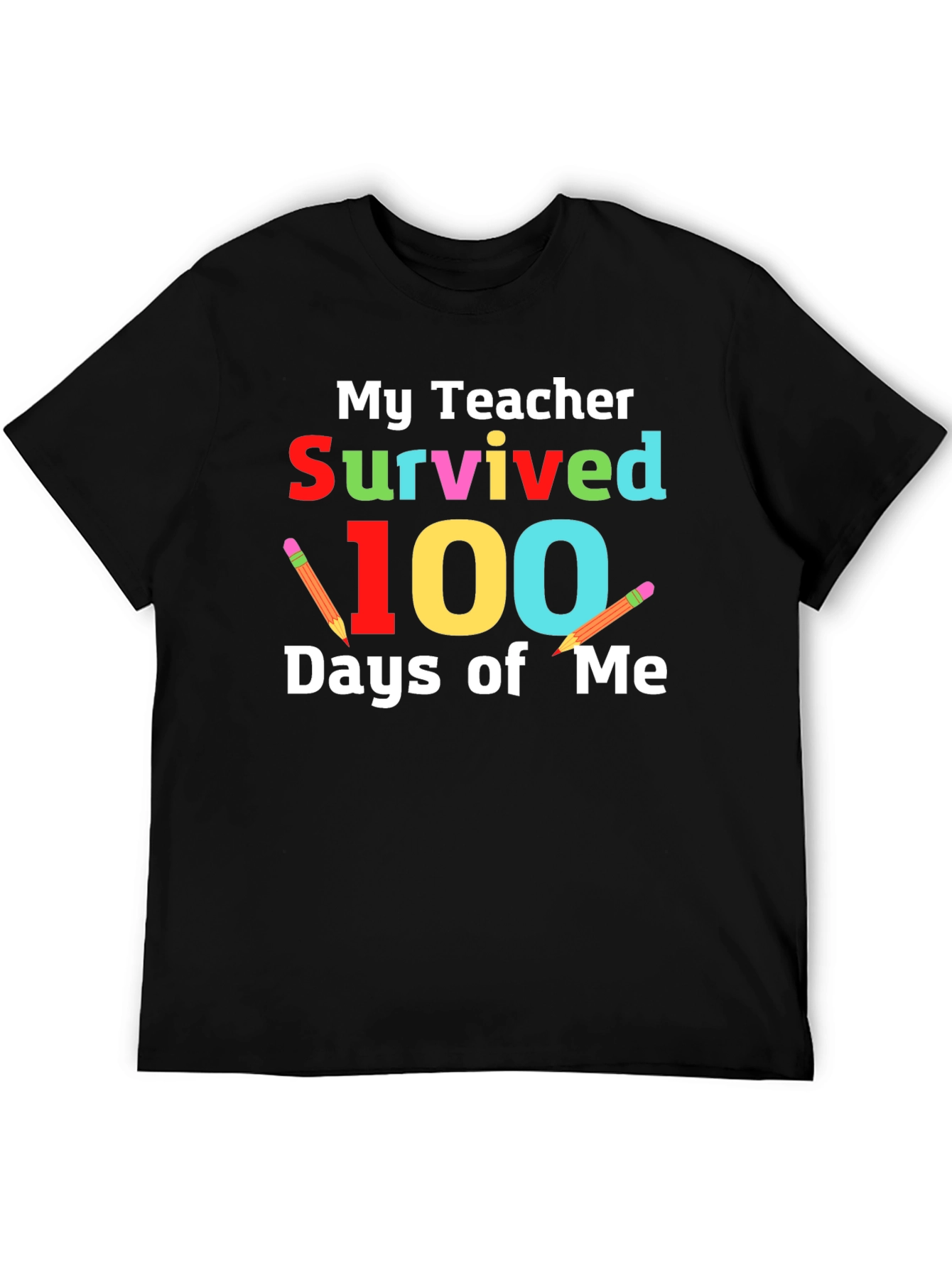 Celebra el espíritu escolar con esta divertida camiseta negra. El diseño llamativo presenta la frase "Mi Maestro Sobrevivió 100 Días de Mí" en colores brillantes y alegres, con ilustraciones de lápices que añaden un toque creativo. Ideal para maestros y estudiantes que desean conmemorar el hito de los 100 días de clases. Perfecta para usar en el aula, eventos escolares o simplemente para mostrar orgullo por la educación. Fabricada con materiales cómodos, esta camiseta es una excelente manera de expresar gratitud y humor. ¡Un regalo perfecto para ese maestro especial en tu vida!