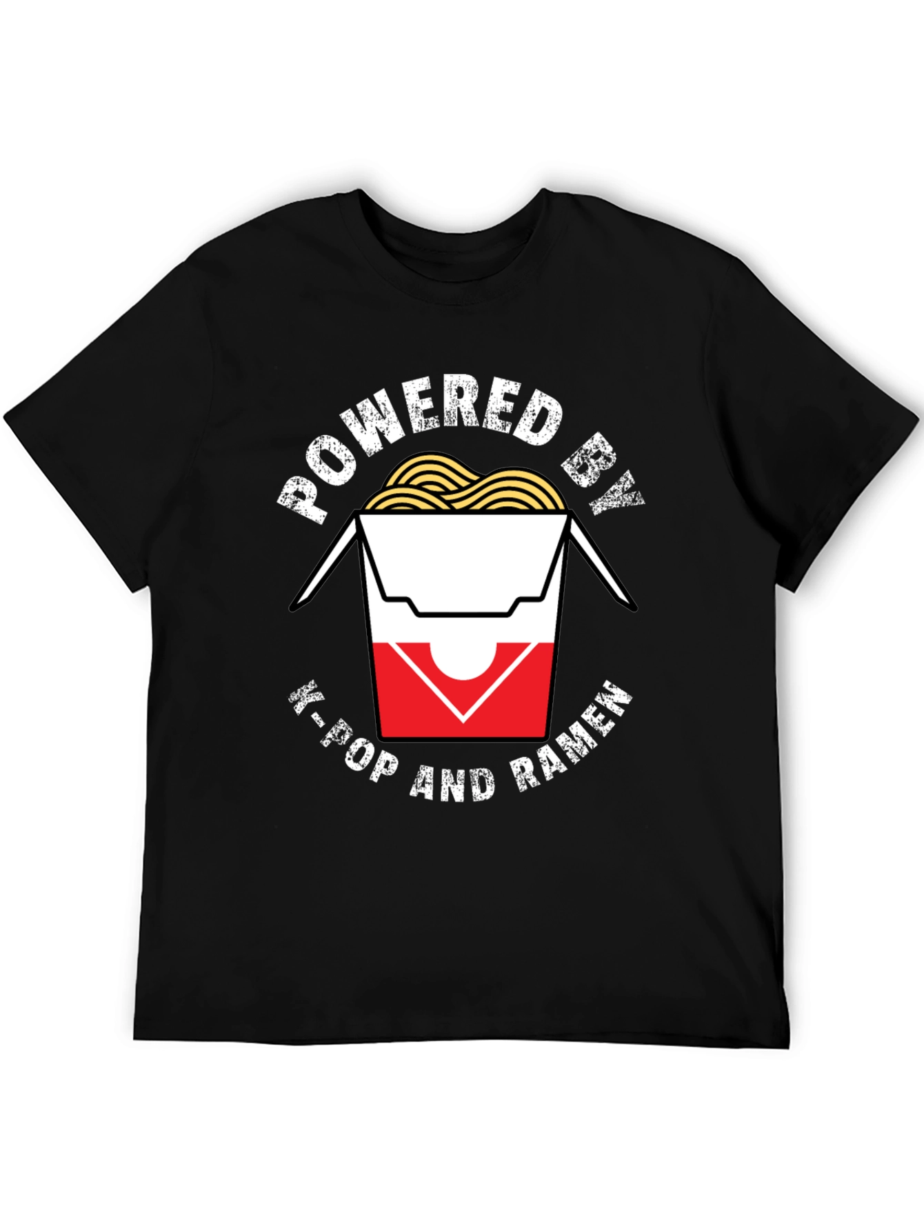 Esta camiseta negra presenta un diseño divertido y original, ideal para los amantes de la cultura pop coreana y la deliciosa comida asiática. El estampado muestra un recipiente de ramen estilizado, con el texto "Powered by K-Pop and Ramen" en una tipografía llamativa y desgastada que le da un toque vintage. Confeccionada en un tejido suave y cómodo, esta camiseta es perfecta para el uso diario, ya sea para lucir un estilo casual o para expresar tu pasión por estas dos aficiones. Ideal para regalar a amigos y familiares que comparten tus gustos.