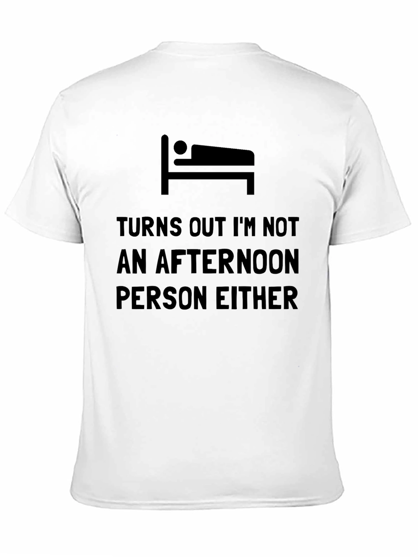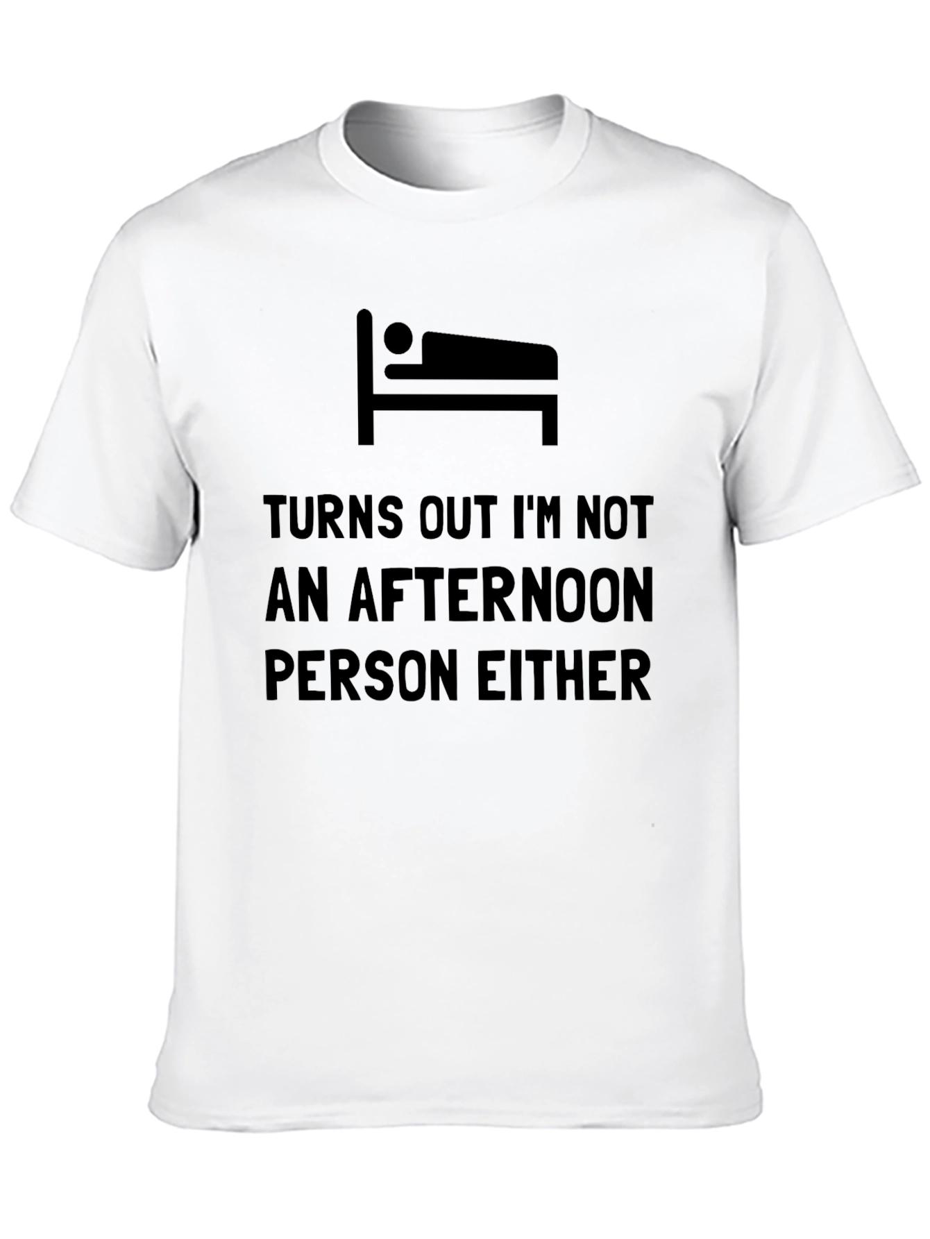 Esta camiseta negra de corte clásico presenta un diseño divertido y relatable para aquellos que no disfrutan de las mañanas. En la parte frontal, se puede ver el dibujo de una persona durmiendo en la cama seguido de la frase "Turns out I'm not an afternoon person either" (Resulta que tampoco soy persona de la tarde), todo en letras mayúsculas de color negro. Perfecta para usar en casa, salir con amigos o para regalar a ese amigo que siempre está cansado. Fabricada con materiales suaves y cómodos, esta camiseta se convertirá en una prenda esencial en tu armario. ¡Demuestra tu amor por dormir con estilo!