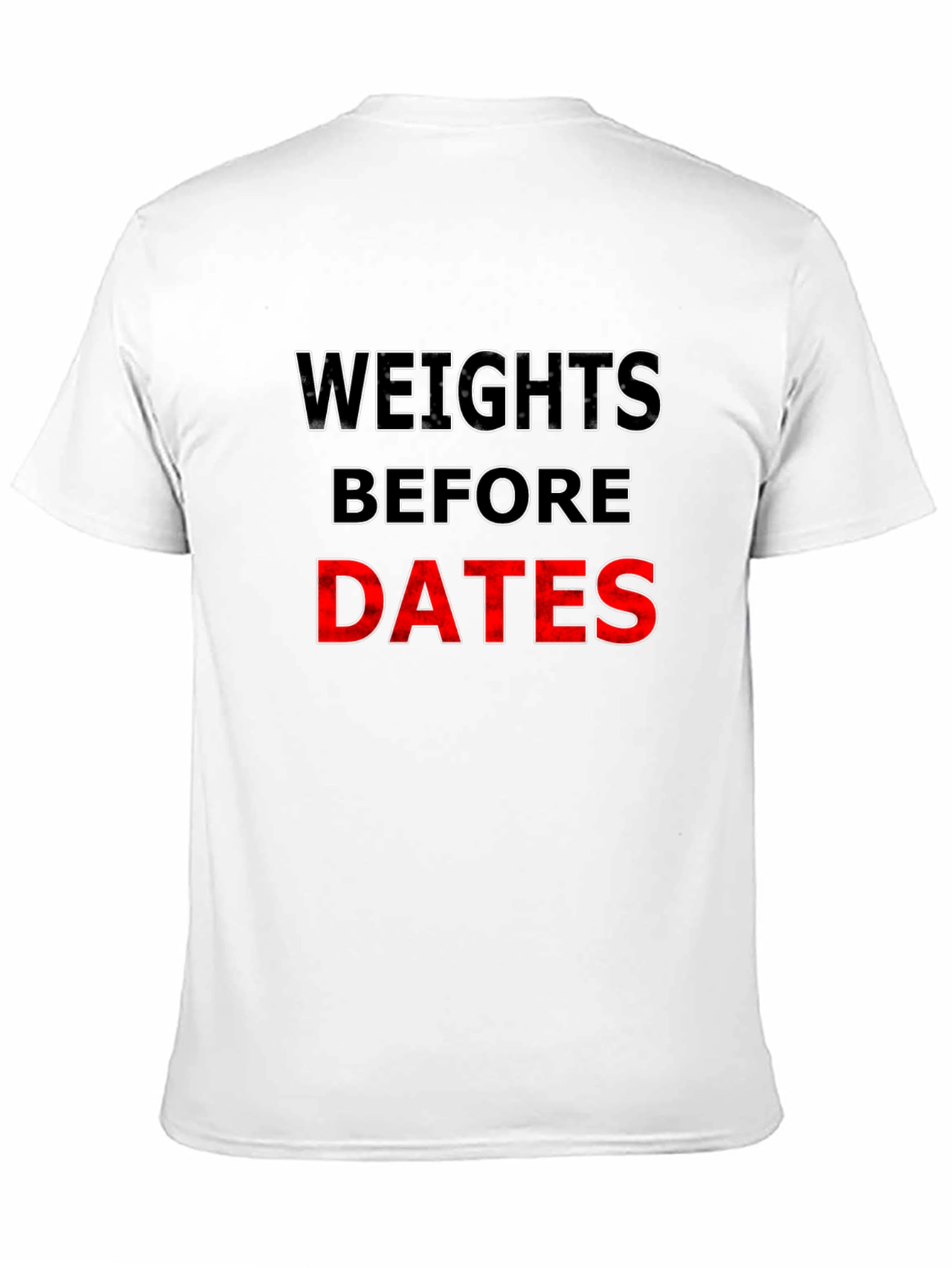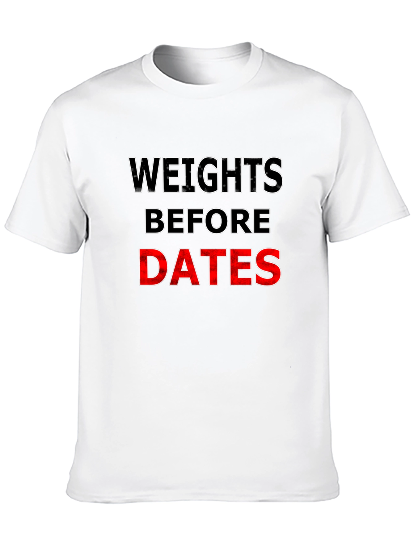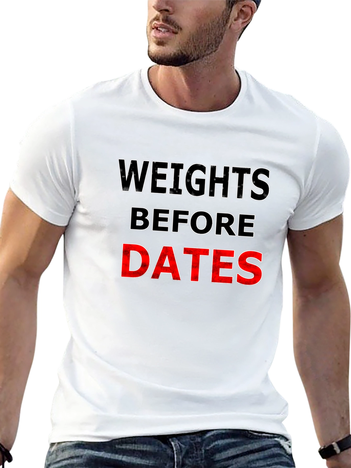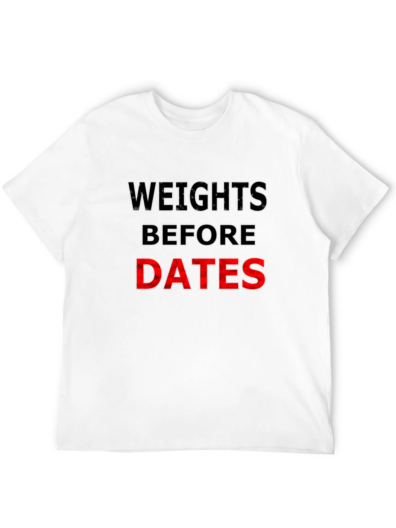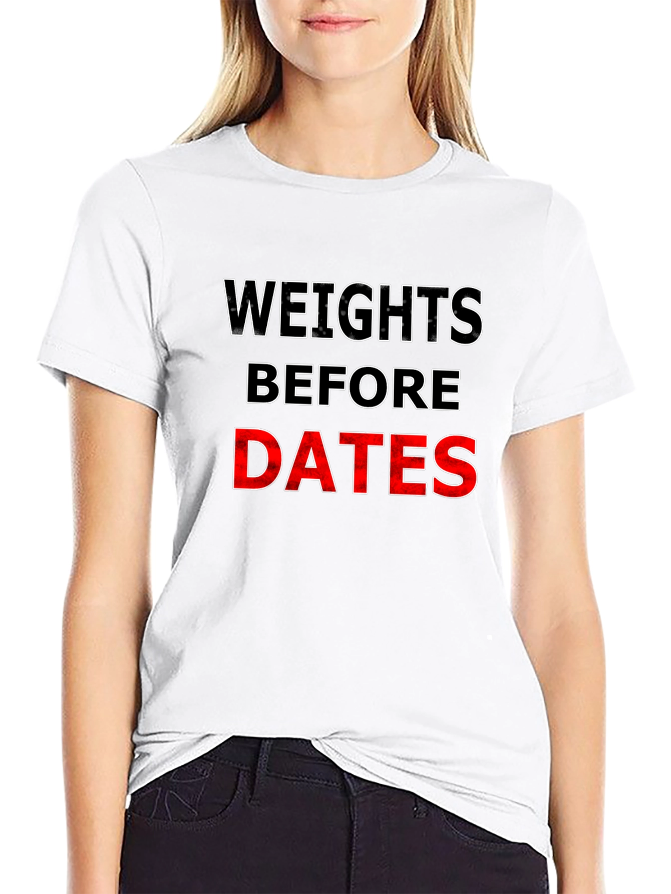 Esta camiseta negra presenta un diseño audaz y divertido para los amantes del fitness. El texto "WEIGHTS BEFORE DATES" está impreso en letras blancas y rojas, resaltando la prioridad del entrenamiento. Perfecta para el gimnasio o para un look casual, esta camiseta es ideal para aquellos que toman en serio su pasión por el ejercicio. Su diseño moderno y llamativo la convierte en una prenda imprescindible para cualquier persona que quiera mostrar su estilo de vida activo y su sentido del humor. ¡Consigue la tuya y haz una declaración!