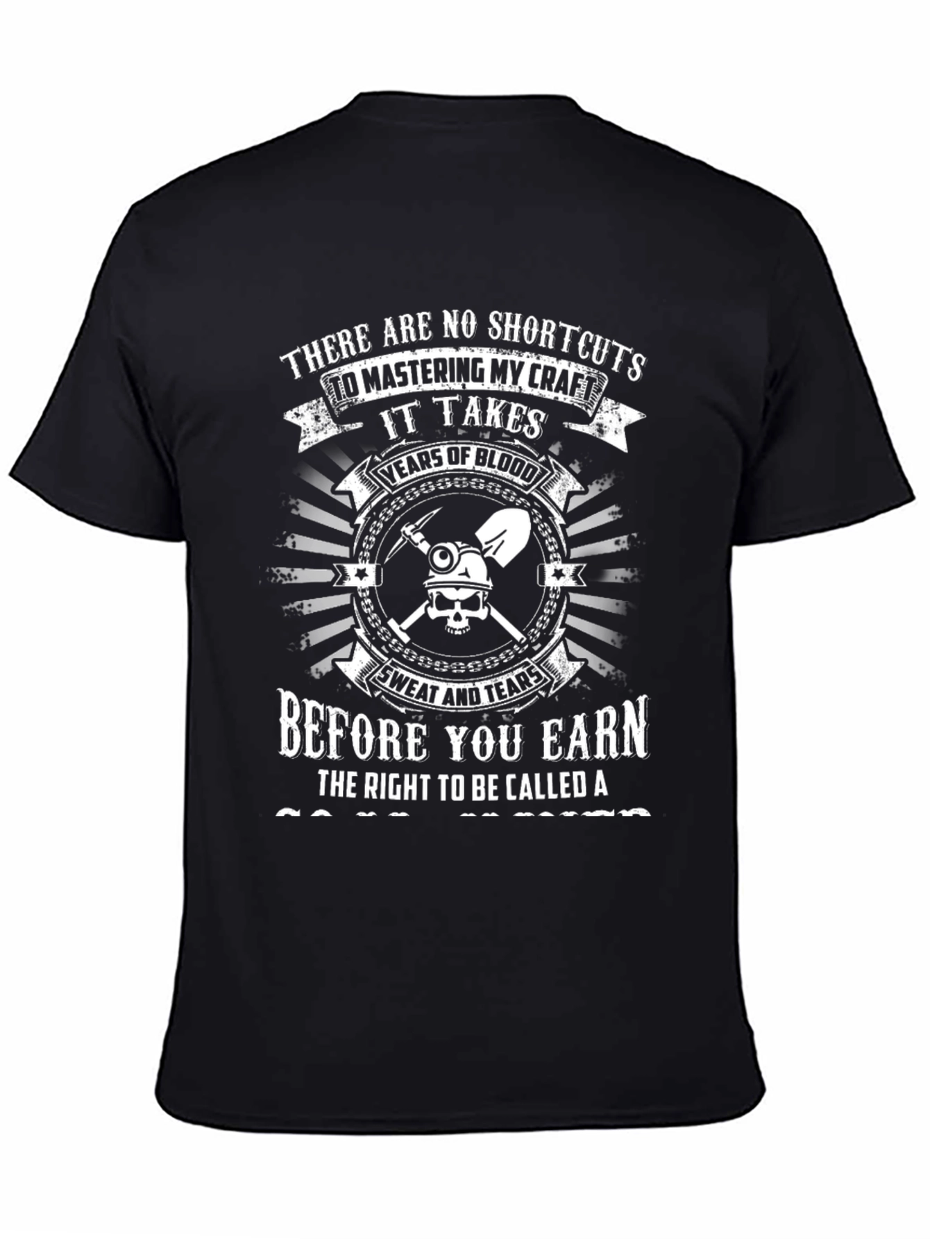 Luce esta llamativa camiseta negra con un diseño robusto y significativo. El gráfico central presenta un cráneo con herramientas, rodeado de texto inspirador que resalta la dedicación y el esfuerzo necesarios para dominar cualquier oficio. La frase "No hay atajos para dominar mi oficio, se necesitan años de sangre, sudor y lágrimas antes de ganarte el derecho a ser llamado..." está estampada en letras impactantes, perfectas para quienes valoran el trabajo duro y la perseverancia. Ideal para el uso diario, esta camiseta combina comodidad con un mensaje potente, atrayendo miradas y generando conversaciones. Una prenda que refleja tu compromiso y pasión por lo que haces.