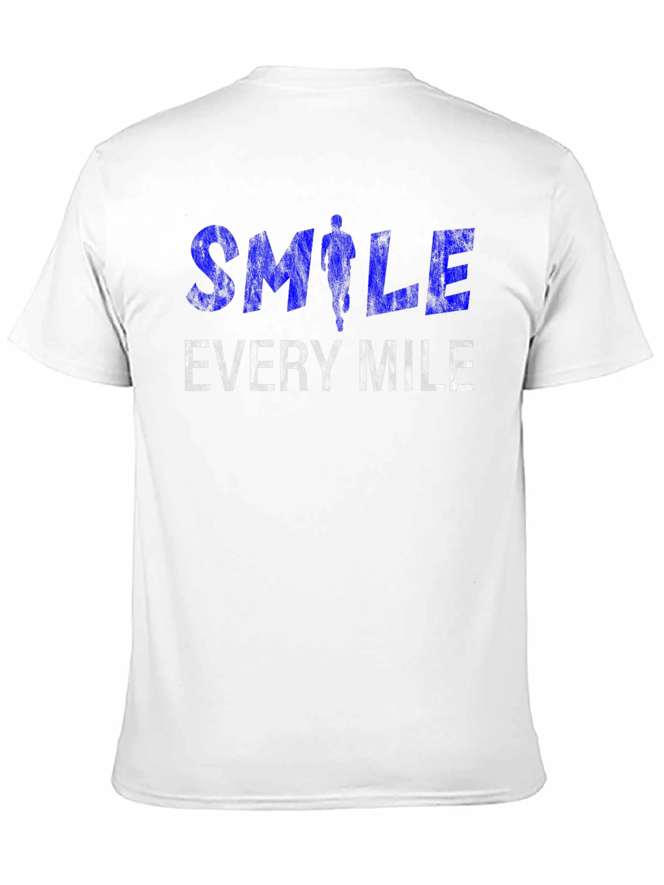 Luce esta llamativa camiseta negra con un diseño inspirador. La frase "SMILE EVERY MILE" (Sonríe Cada Milla) destaca en la parte frontal, con la palabra "SMILE" en azul y la silueta de un corredor integrándose en el diseño. "EVERY MILE" aparece debajo en color blanco, creando un contraste llamativo. Perfecta para corredores, atletas, o cualquier persona que busque un toque de motivación en su vestimenta diaria. Ideal para usar durante tus entrenamientos, carreras o simplemente para un look casual y deportivo. Esta camiseta es una excelente manera de expresar tu pasión por el running y tu actitud positiva.