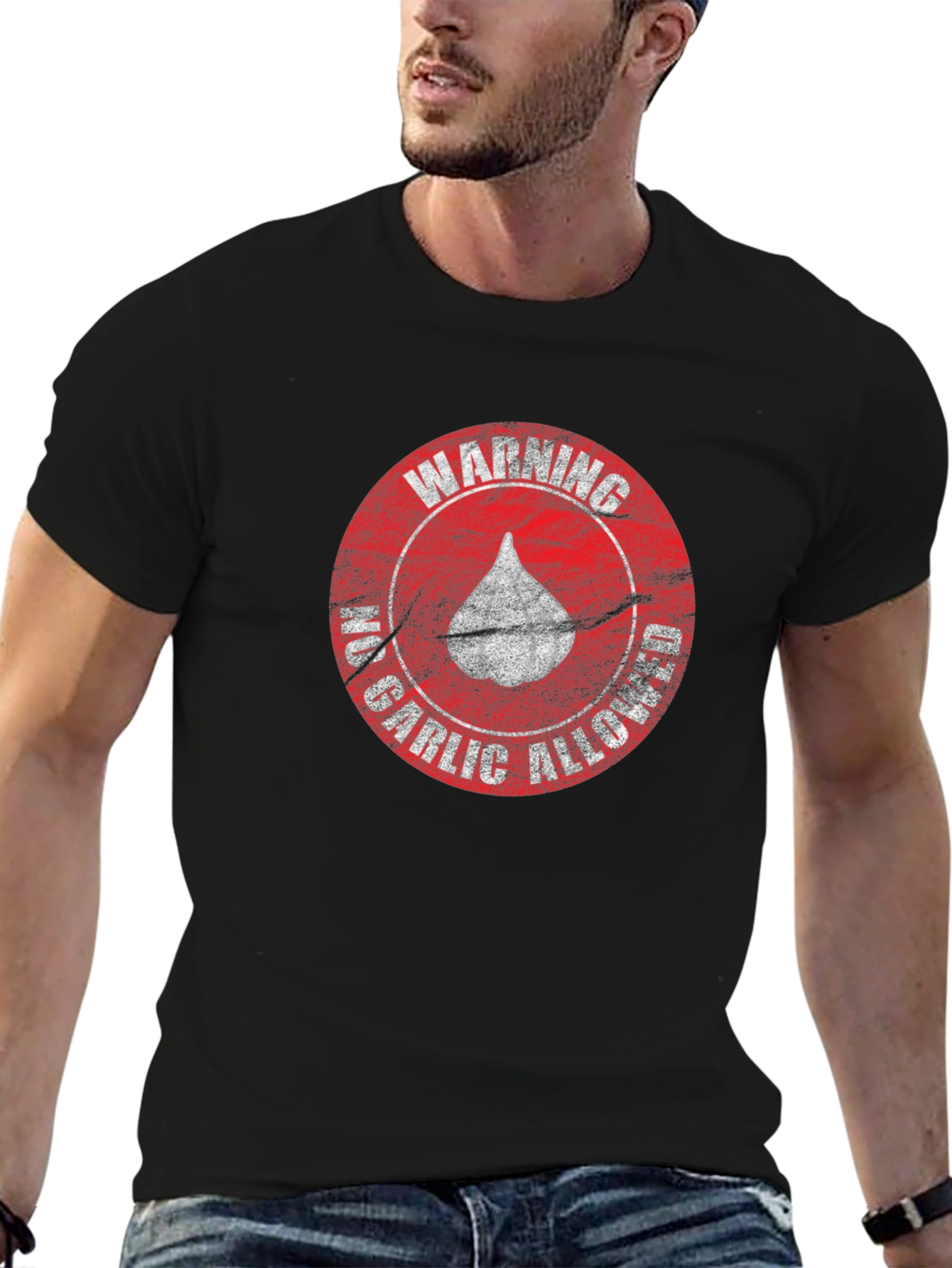 Luce esta llamativa camiseta negra con un diseño peculiar. Un círculo rojo grunge advierte: "No Garlic Allowed" (Prohibido el Ajo), con una imagen estilizada de un diente de ajo en el centro. Ideal para aquellos con alergias, amantes de la cocina sin ajo, o simplemente para mostrar un sentido del humor único. Perfecta para usar a diario, en reuniones informales o eventos sociales donde quieras destacar. El diseño de advertencia es llamativo y provocador, asegurando que te vean y te recuerden. Fabricada con materiales cómodos y duraderos, esta camiseta será una adición divertida y funcional a tu guardarropa. ¡Declara tu amor (o aversión) por el ajo con estilo!
