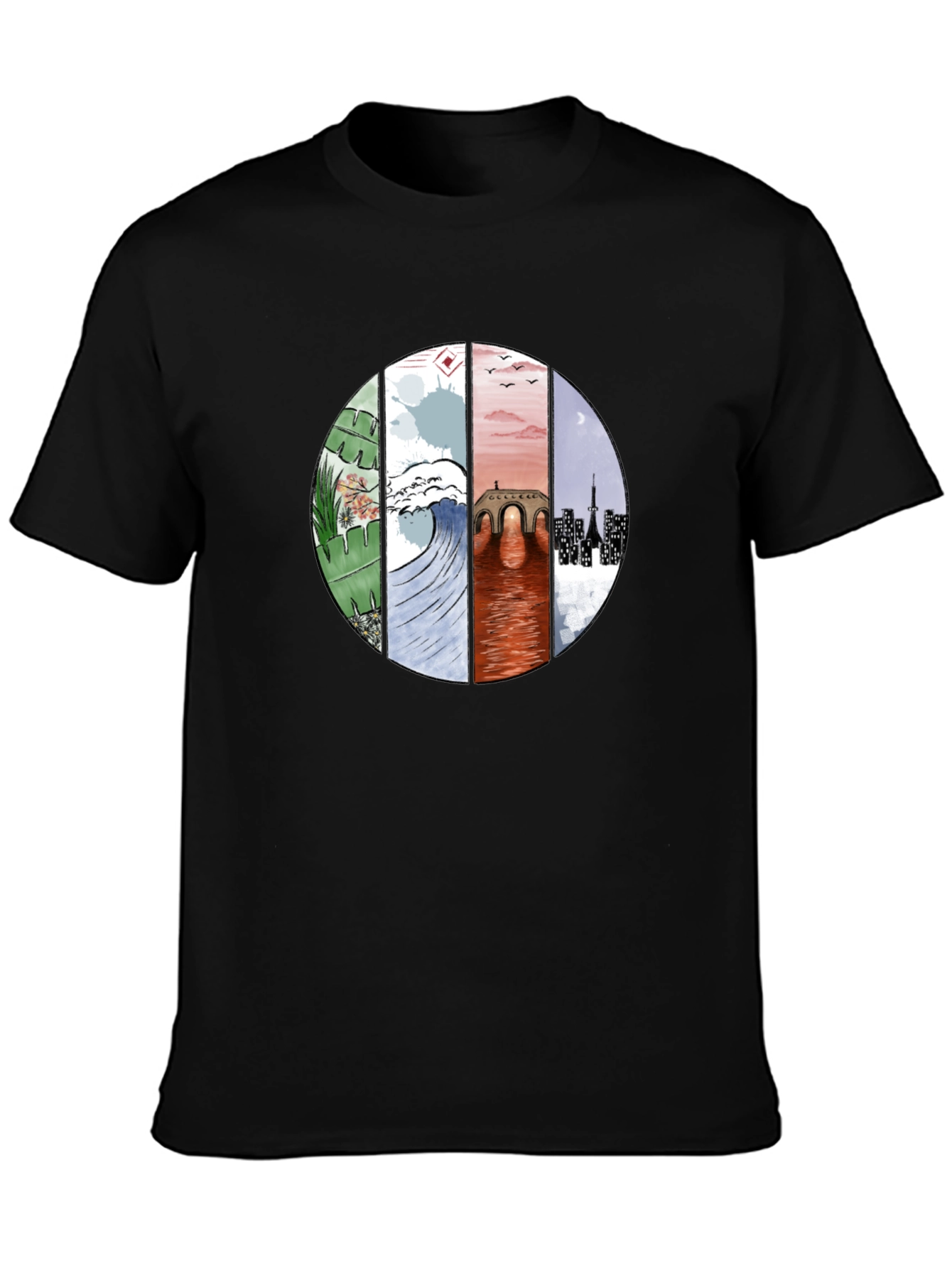 Esta camiseta negra de manga corta presenta un llamativo diseño circular abstracto. El diseño se compone de cinco segmentos verticales que representan elementos de la naturaleza y paisajes urbanos. Se puede apreciar vegetación tropical, olas del mar, un puente con arquitectura clásica y un horizonte urbano con una torre destacada. El diseño circular está centrado en el pecho, añadiendo un toque artístico y moderno. Hecha de un material aparentemente suave y cómodo, esta camiseta es ideal para uso casual, perfecta para expresar un estilo único y relajado. Su diseño versátil la hace adecuada para diversas ocasiones, desde salidas informales hasta eventos sociales relajados. ¡Añade esta prenda única a tu guardarropa!