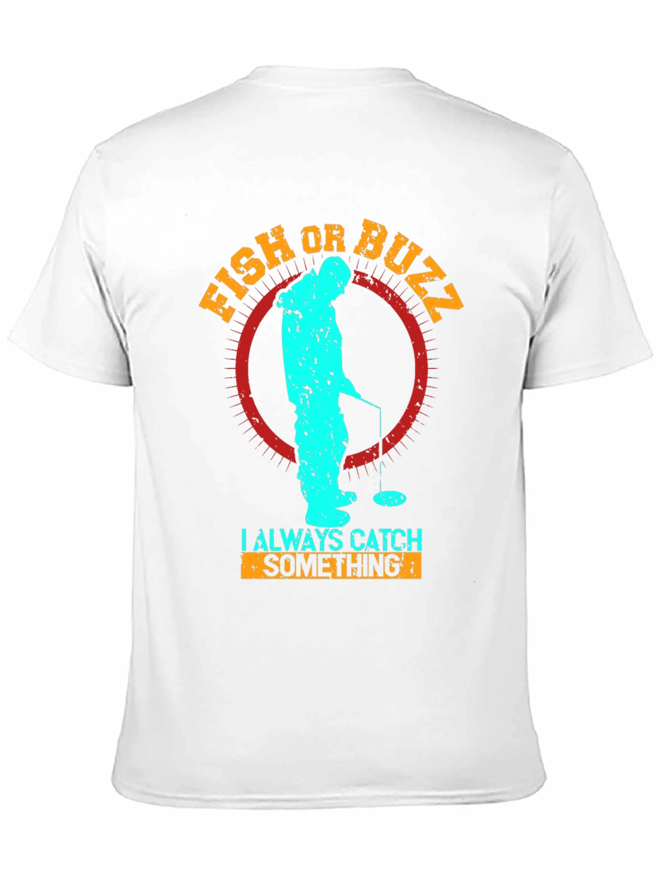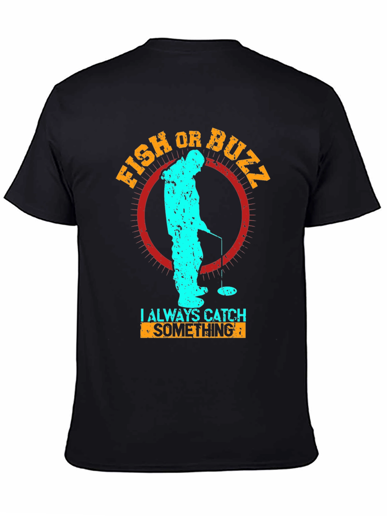 Luce esta original camiseta negra con un llamativo diseño temático de pesca en hielo. El estampado presenta una silueta texturizada en color turquesa de una persona pescando sobre un círculo rojo desgastado, con las palabras "FISH OR BUZZ" en la parte superior y "I ALWAYS CATCH SOMETHING" en la inferior, ambas en color naranja. Perfecta para los amantes de la pesca y las actividades al aire libre, esta camiseta de manga corta es ideal para un look casual y relajado. Fabricada con materiales suaves y cómodos, es perfecta para llevar en tus aventuras de pesca o para el día a día. ¡Atrae todas las miradas con esta prenda única y divertida!