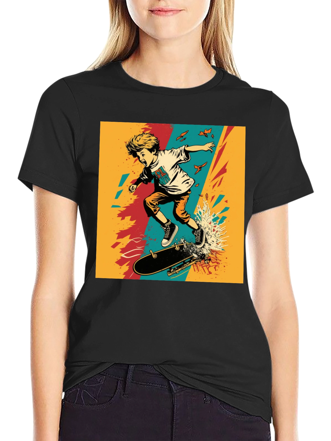 Esta camiseta negra presenta un diseño vibrante y dinámico de un niño en una patineta sobre un fondo abstracto de colores llamativos. El diseño está centrado en el pecho, convirtiendo esta camiseta en una pieza llamativa y moderna. Fabricada con materiales suaves y cómodos, esta camiseta es perfecta para el uso diario, ya sea para un día casual o para salir con amigos. Su diseño único y moderno la convierte en una excelente opción para los amantes del skateboard y aquellos que buscan destacar con un estilo original. Combínala con jeans, pantalones cortos o faldas para un look versátil y a la moda. ¡Atrévete a expresar tu individualidad con esta increíble camiseta!