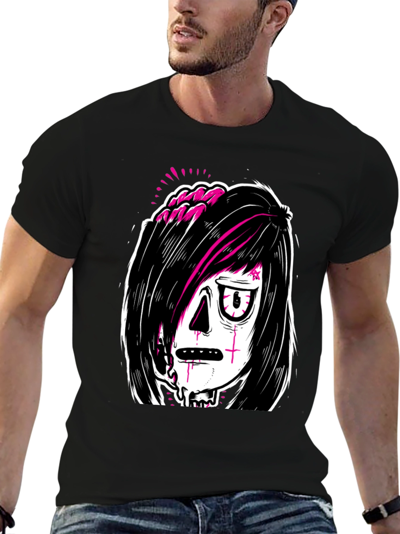 Destaca con esta camiseta negra de manga corta, que presenta un audaz estampado gótico en el frente. El diseño en blanco y negro con toques de rosa neón crea un contraste llamativo y moderno. Fabricada con materiales suaves y cómodos, esta camiseta es perfecta para expresar tu estilo individual y destacar entre la multitud. Combínala con jeans oscuros o una falda para un look casual pero atrevido. Ideal para conciertos, salidas nocturnas o simplemente para añadir un toque de rebeldía a tu vestuario diario. ¡Una declaración de moda audaz y original!