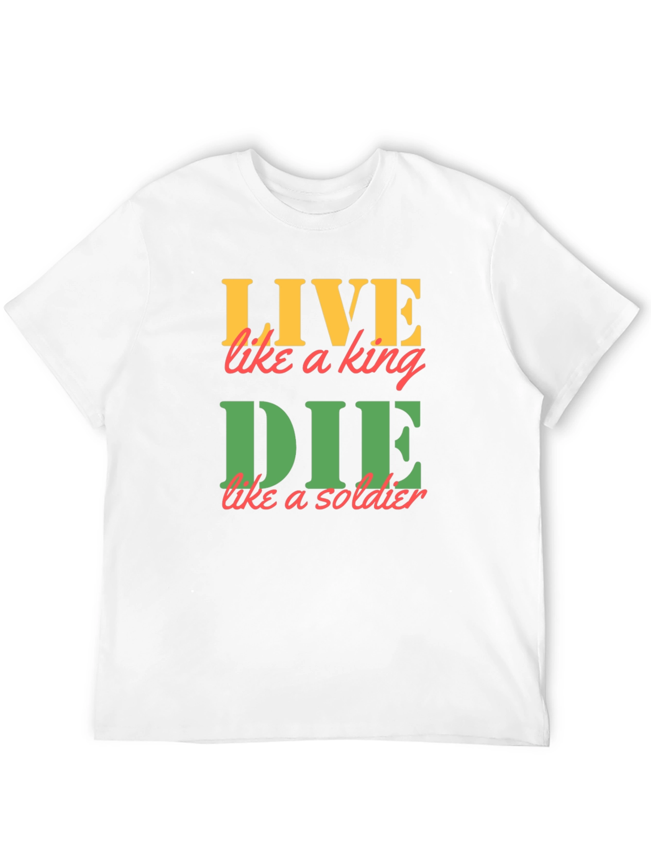 Luce esta moderna camiseta negra de manga corta con un diseño audaz y llamativo. Presenta un estampado en colores vibrantes con la frase "LIVE like a king DIE like a soldier". Ideal para expresar tu personalidad y actitud. Fabricada con materiales cómodos y duraderos, esta camiseta es perfecta para el uso diario, ya sea para salir con amigos o para un look casual pero con estilo. Combínala con tus jeans o pantalones favoritos y muestra tu espíritu único. Una prenda imprescindible para tu guardarropa.