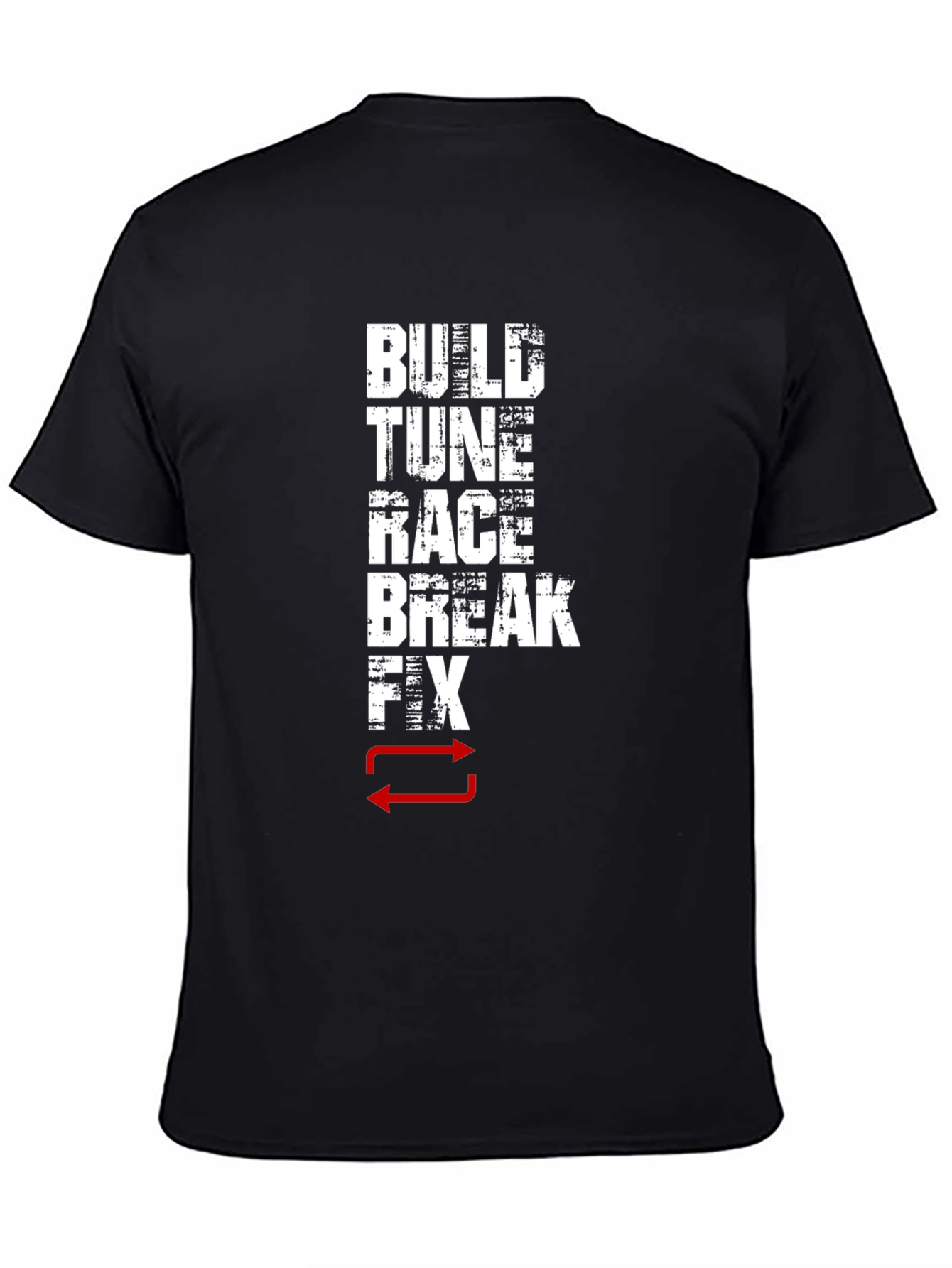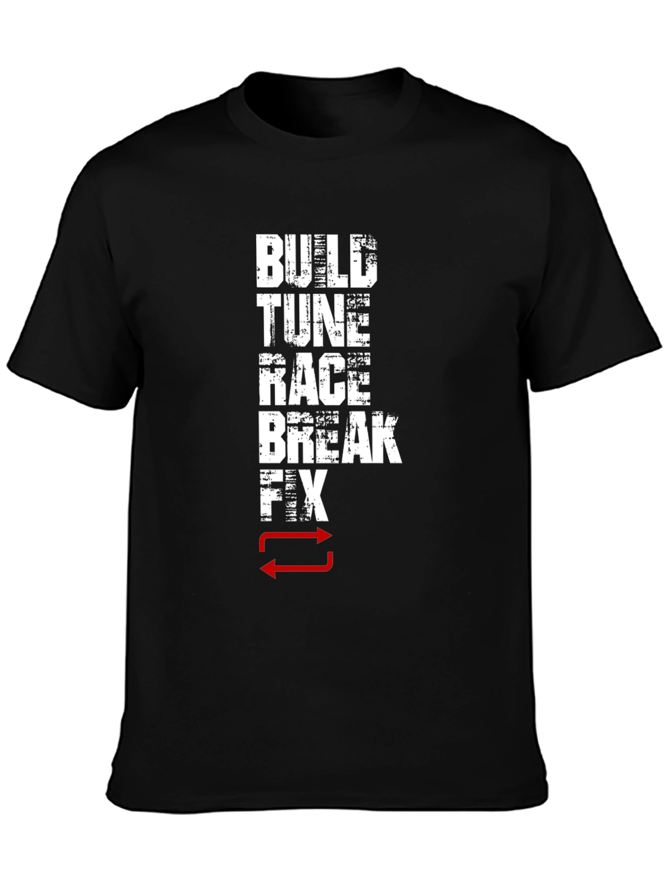 Luce esta moderna camiseta negra, perfecta para los entusiastas de los coches y la mecánica. Confeccionada en suave algodón, ofrece comodidad y estilo. El diseño presenta un estampado vertical en blanco que dice "BUILD, TUNE, RACE, BREAK, FIX", seguido de flechas rojas en ciclo, evocando el proceso constante de modificar y reparar vehículos. Ideal para llevar en encuentros de coches, el taller, o simplemente para expresar tu pasión por el mundo del motor. Esta camiseta es una declaración de intenciones para aquellos que viven y respiran la cultura automotriz. ¡Hazte con ella y muestra tu amor por la velocidad y la ingeniería!