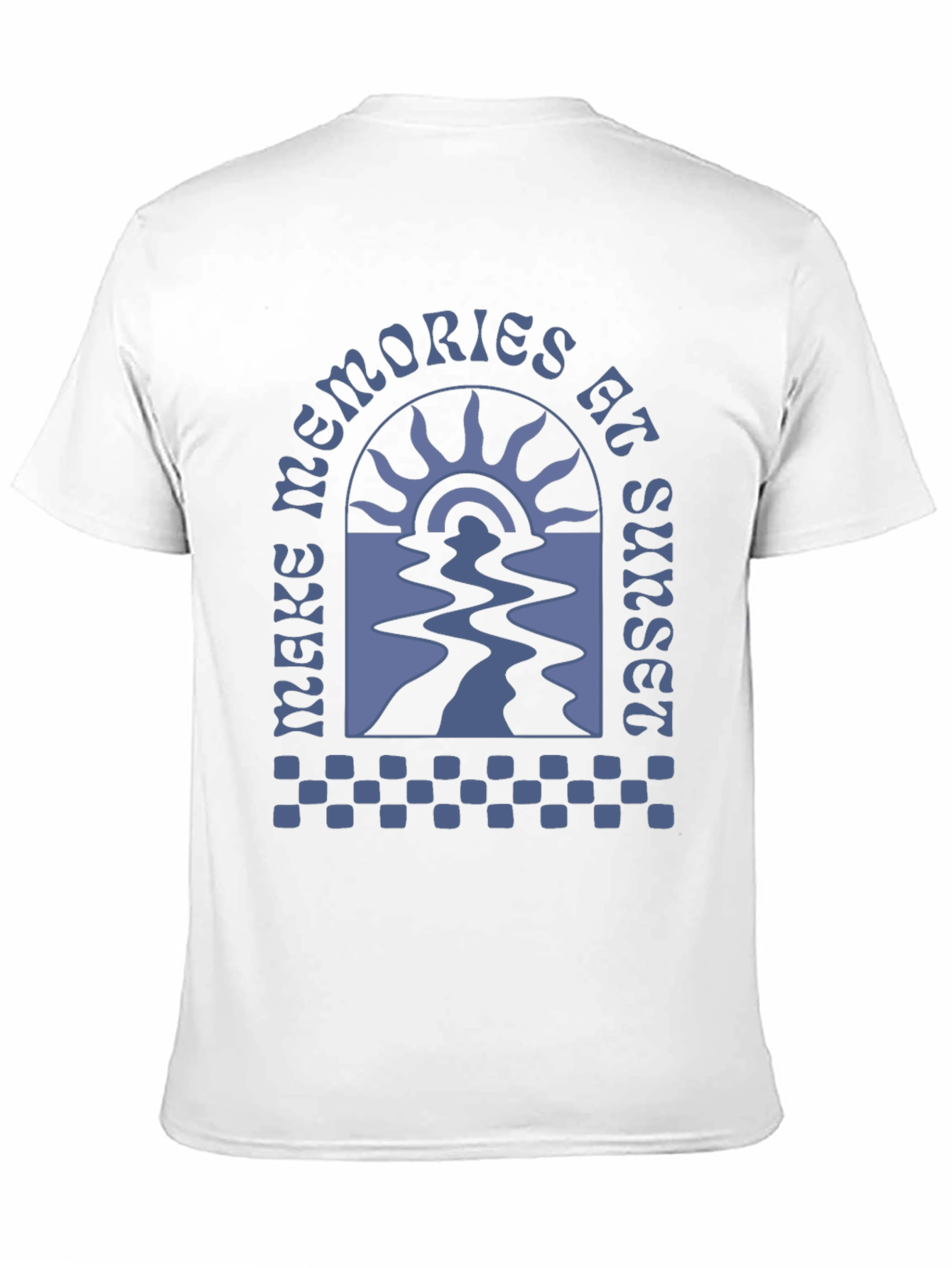 Descubre esta camiseta negra de algodón con un diseño único. Presenta un gráfico llamativo en tono azul con la frase "Make Memories at Sunset" que evoca momentos especiales al aire libre. El diseño incluye un sol radiante sobre un paisaje acuático estilizado, enmarcado por un patrón de damas. Esta camiseta de corte clásico es perfecta para un look casual y relajado, ideal para usar en tus aventuras diarias o para compartir con amigos en una tarde de verano. ¡Añade un toque artístico y veraniego a tu guardarropa con esta prenda cómoda y original!