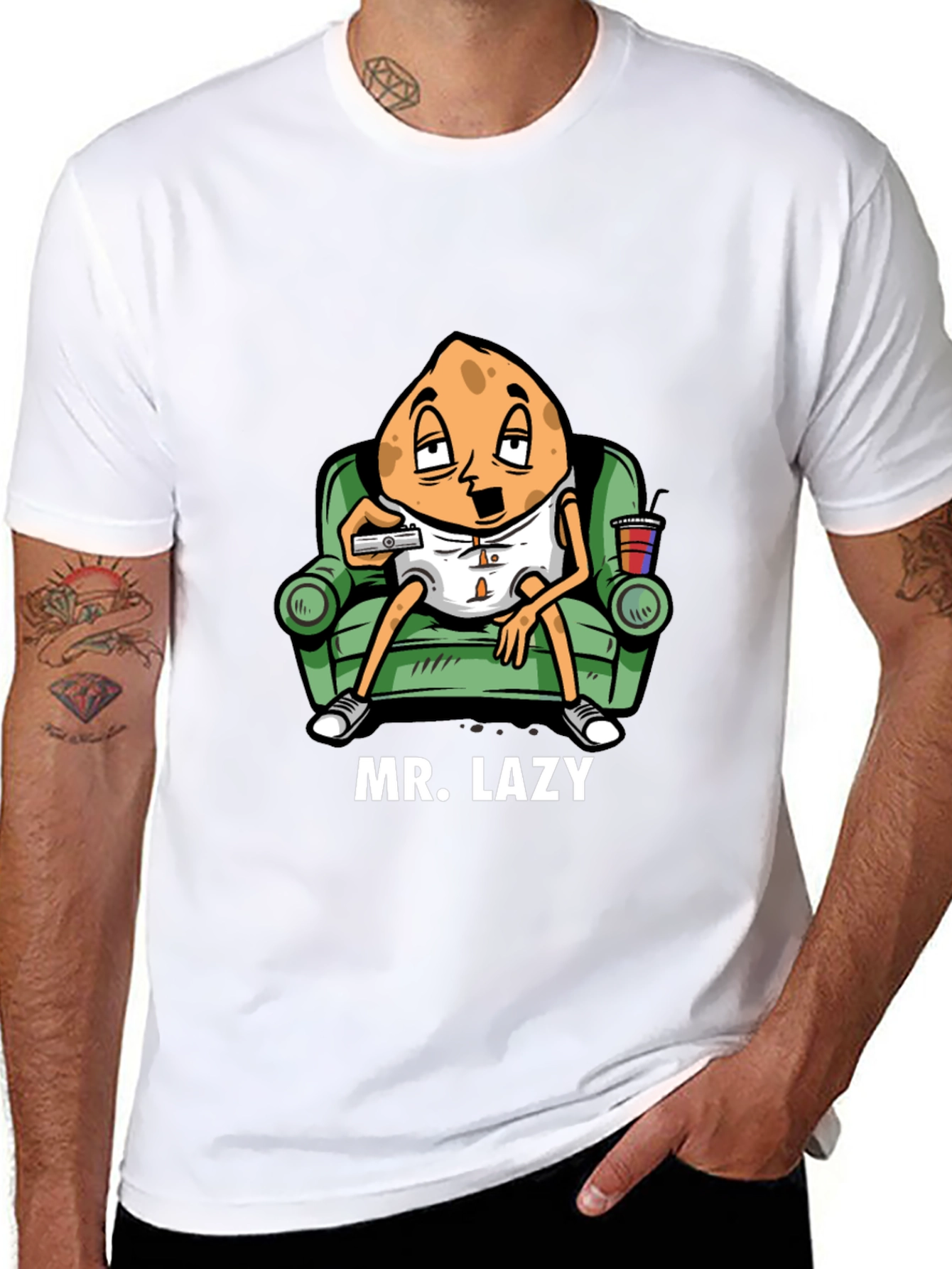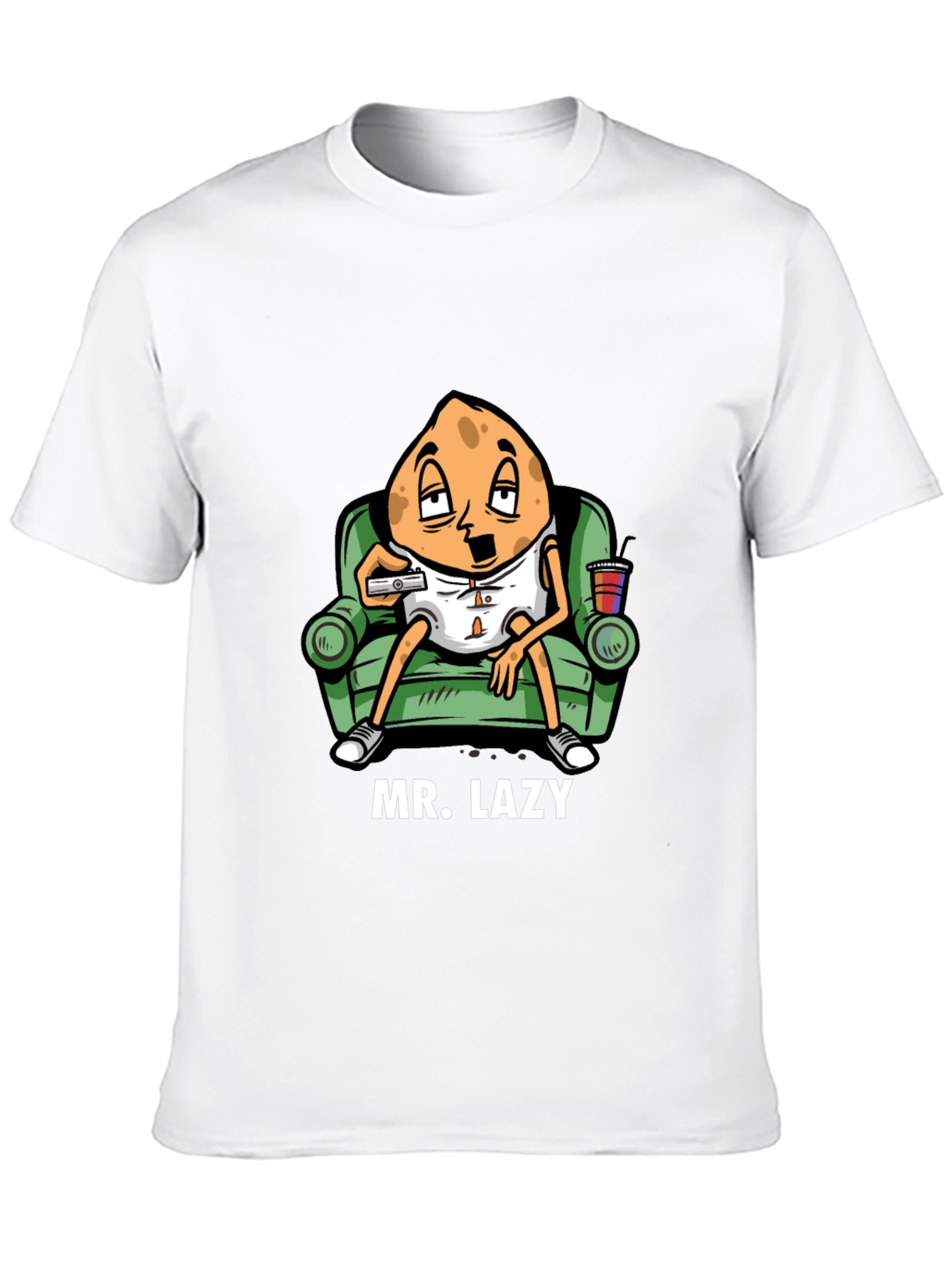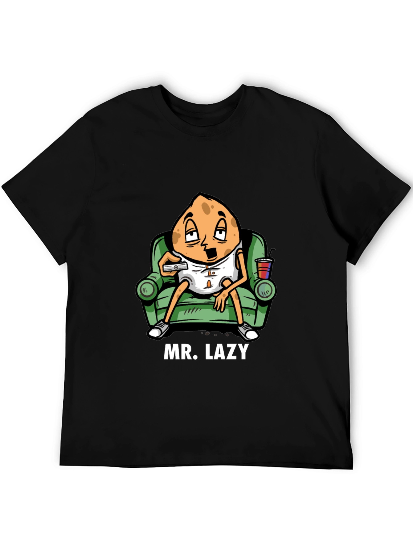 Esta camiseta negra de manga corta presenta un diseño divertido y relajado, perfecta para quienes aman el confort y el humor. En el centro, se muestra un personaje animado de forma curiosa sentado en un sillón verde, con un control remoto en la mano y un refresco a su lado, evocando una escena de relajación total. El texto "MR. LAZY" completa el diseño, añadiendo un toque ingenioso. Ideal para uso casual, esta camiseta es una excelente opción para expresar tu sentido del humor y tu amor por la comodidad. Hecha con materiales suaves al tacto, promete confort durante todo el día.