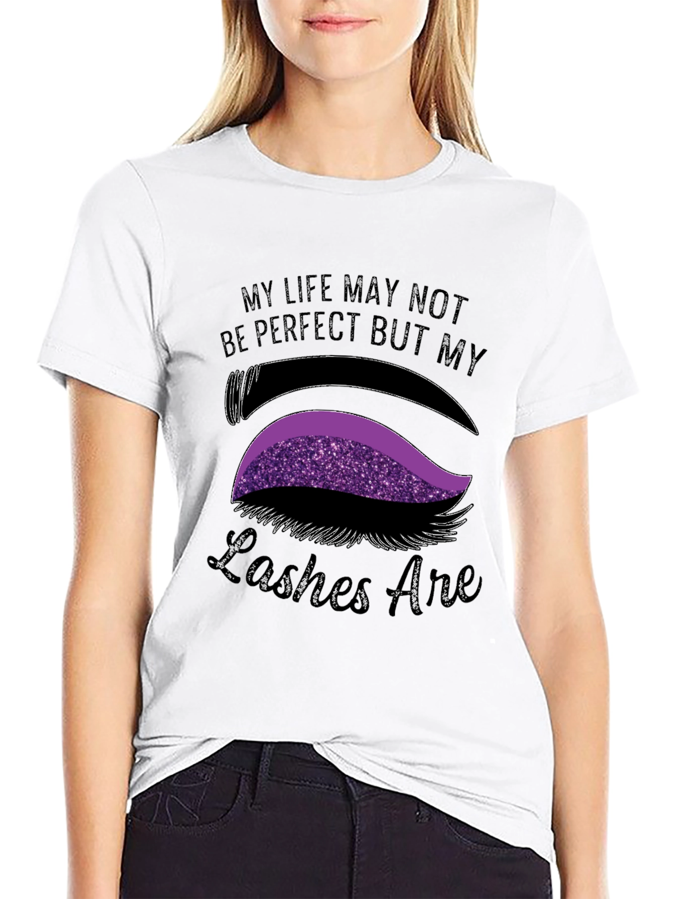 Esta camiseta negra presenta un diseño llamativo de un ojo con sombra de ojos morada brillante y largas pestañas. La frase "My life may not be perfect but my lashes are" añade un toque de humor y actitud. Perfecta para amantes del maquillaje y el estilo personal, esta camiseta de corte clásico ofrece comodidad y un look moderno. Ideal para uso diario, eventos casuales o para expresar tu pasión por la belleza. Un diseño único que captura la atención y refleja tu personalidad.